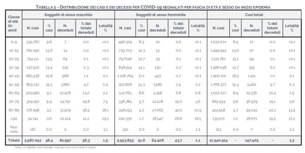 Al 15 febbraio 2022 ci sono stati 12.134.451 di contagi confermati dal Ministero della Salute e dalla Fondazione Gimbe (link), il 20,38% della popolazione italiana. I deceduti sarebbero 151.296 e quindi il tasso di mortalità annuale sarebbe lo 0,13%. Il report "Caratteristiche dei pazienti deceduti positivi all'infezione da SARS-CoV-2 in Italia" aggiornato al 10 gennaio 2022 dall'Istituto Superiore di Sanità italiano (file) espone il seguente grafico sintesi: